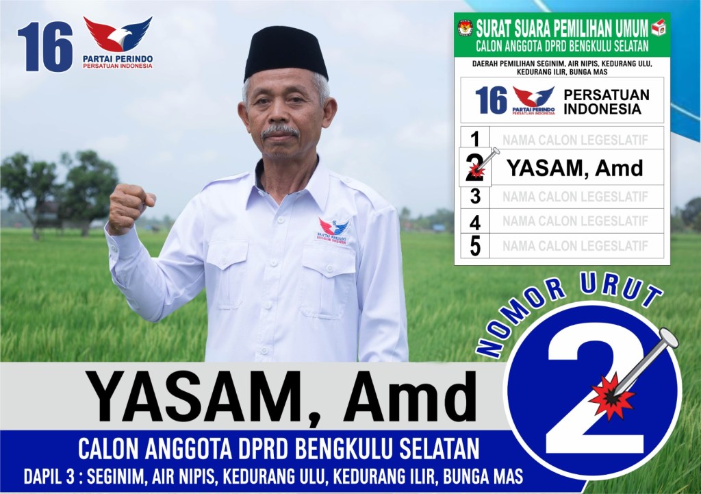 “Kami (Yasam, A.Md.) kader partai Perindo dengan segala kerendahan hati berharap dengan adik sanak untuk memberikan dukungannya dan do’a untuk memilih kami sebagai wakil rakyat agar kami dapat memperjuangkan aspirasi adik sanak di DPRD Bengkulu Selatan priode lima tahun ke depan,” ucapnya dengan senyum dan merendahkan diri.